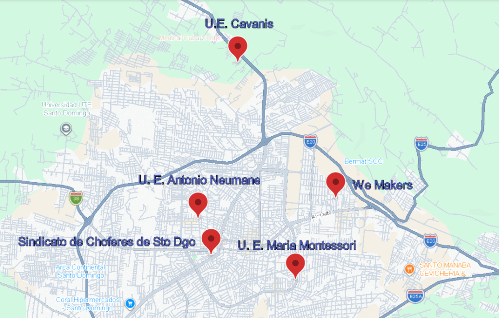 📍 6 Sedes disponibles: U.E. Neumane, U.E. Cavanis, U.E. María Montessori, U.E. Luz y Libertad (La Concordia), Sindicato de Choferes y Sede Central We Makers.